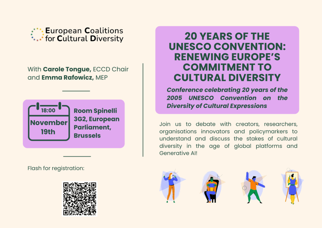 The European Coalitions for Cultural Diversity (ECCD) and MEP Emma Rafowicz invite you to a conference–debate at the European Parliament to mark the 20th anniversary of the 2005 UNESCO Convention on the Protection and Promotion of the Diversity of Cultural Expressions, ratified by the European Union.